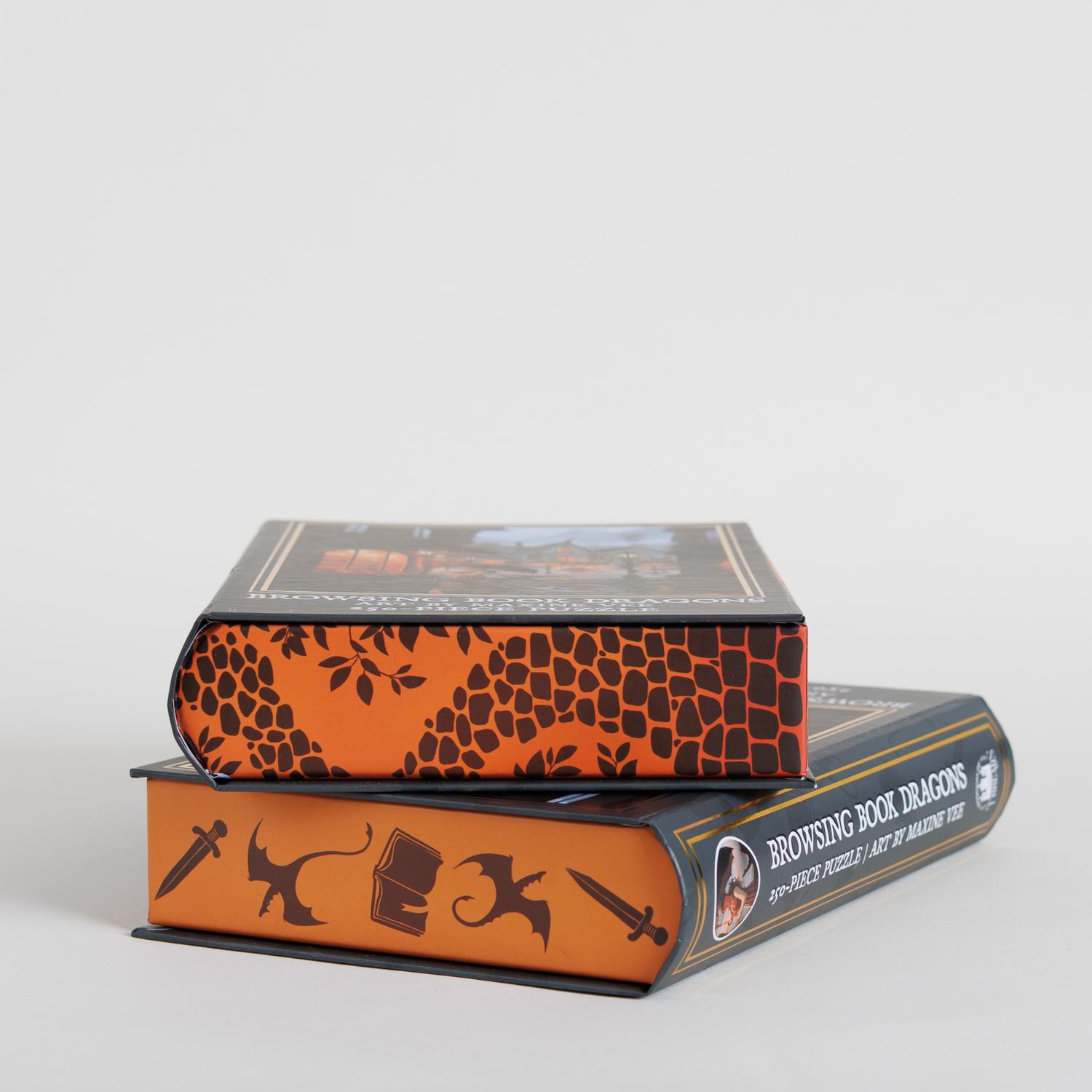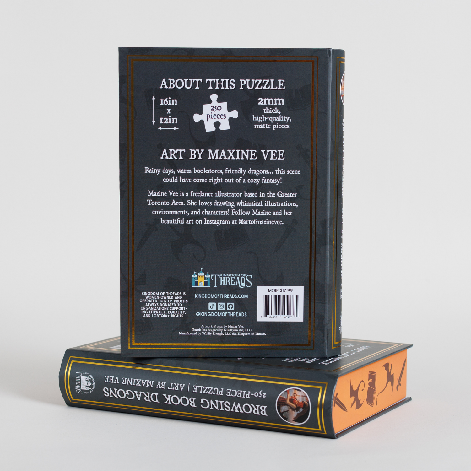Rainy days, warm bookstores, friendly dragons… this scene could have come right out of a cozy fantasy! This gorgeous puzzle is perfect for all your customers who dream of a cozy life with adorable little dragons by their side. This incredible puzzle comes in a book-shaped keepsake box complete with sprayed edges, beautiful interior art, and a magnetic closure. This is the perfect gift for the reader who has everything. Art by Maxine Vee -- Maxine Vee is a freelance illustrator based in the Greater Toronto area. She loves drawing whimsical illustrations, environments, and characters! Follow Maxine online as artofmaxinevee. *Puzzle Details* -250-piece puzzle -16 x 12 inches -2mm thick, high-quality, matte pieces -Beautiful, book-shaped keepsake box with sprayed edge design, interior art, and magnetic closure -4 ⅞ x 5 ½ inch print of the puzzle art *Packaging Details* -Keepsake box: 5½ x 8 x 1½ inches -