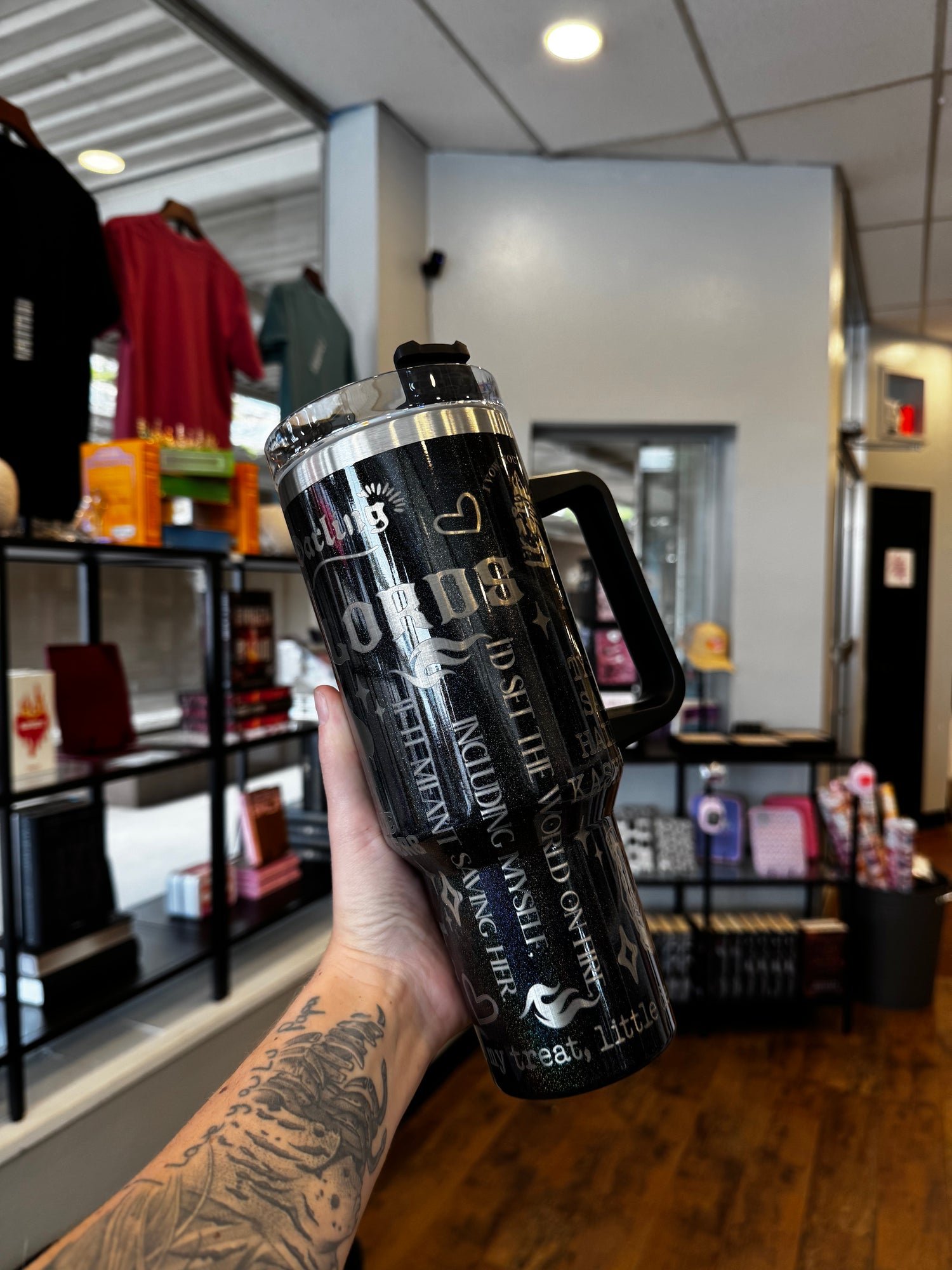 40 oz tumbler in black and silver. Features images from the LORDS books.