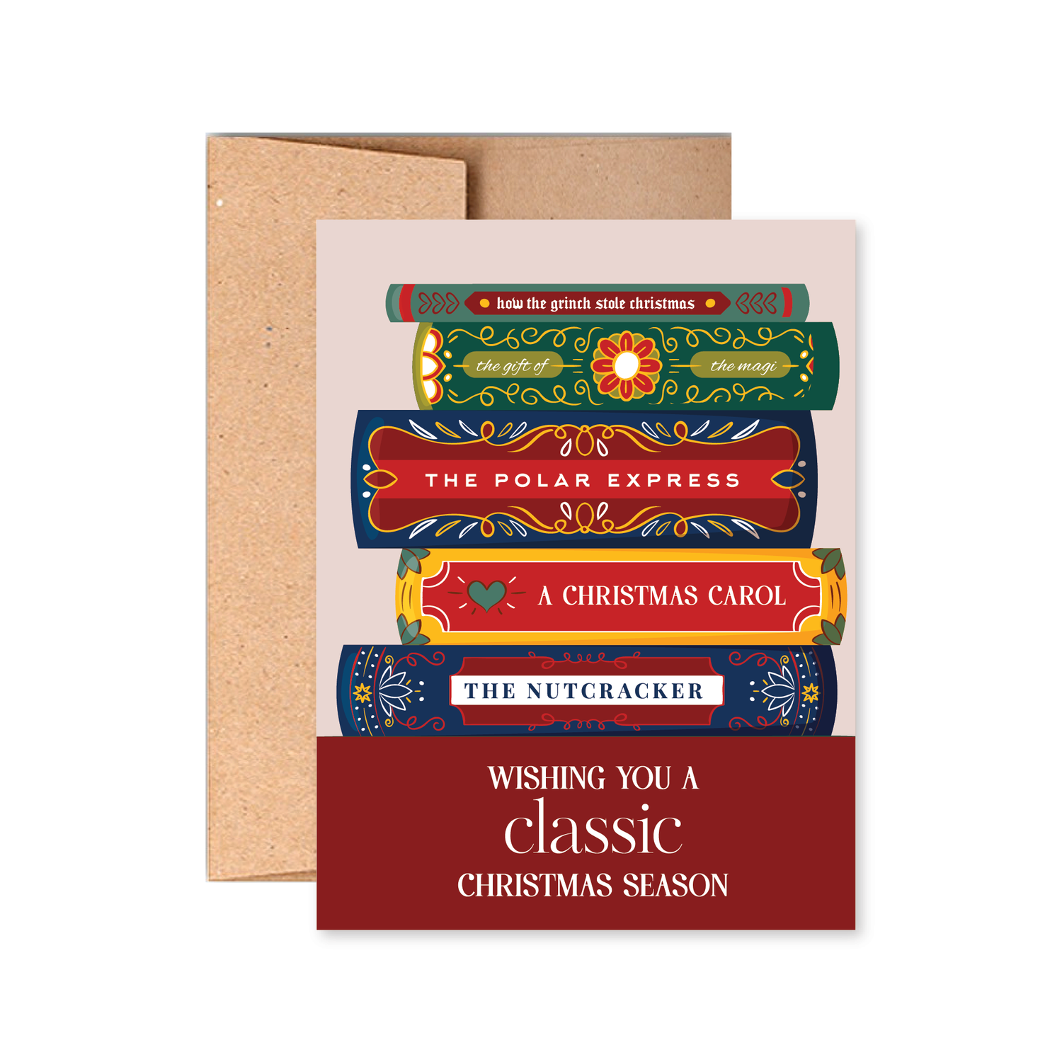 Send your very warmest wishes this holiday season with this Christmas card! Featuring a stack of books featuring some of the best classic Christmas stories, grab this card and send off your Christmas cheer!